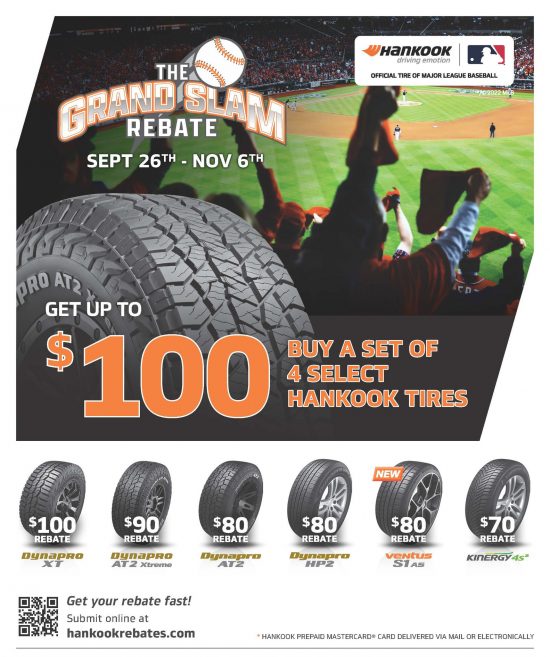 Purchase a set of four (4) qualifying tires between September 26, and November 6, 2022 and receive up to $100 off! Submit your rebate online.
